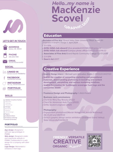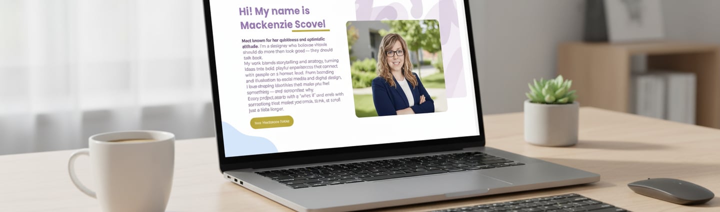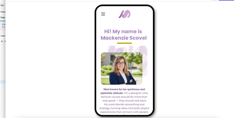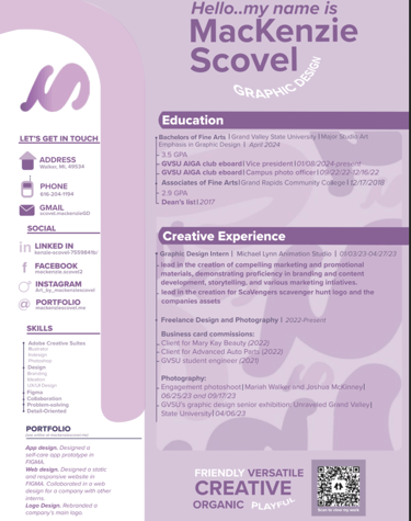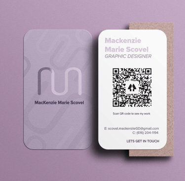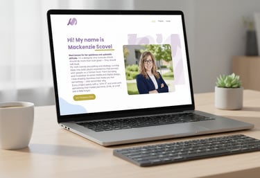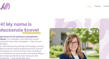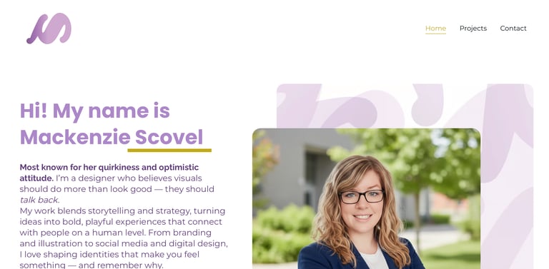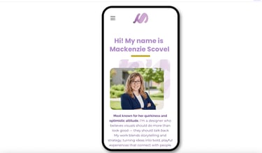 My logo is a custom monogram designed to be the single, flowing visual mark of my personal brand. It's a stylized, continuous form that suggests the letter 'M' (for MacKenzie), giving it an abstract, organic quality that feels approachable and modern. The monogram is also supposed to give you the illlusion of a sideway 'S'. I chose a soft, gradient purple to connect directly with the overarching optimistic and creative aesthetic of my website and resume.