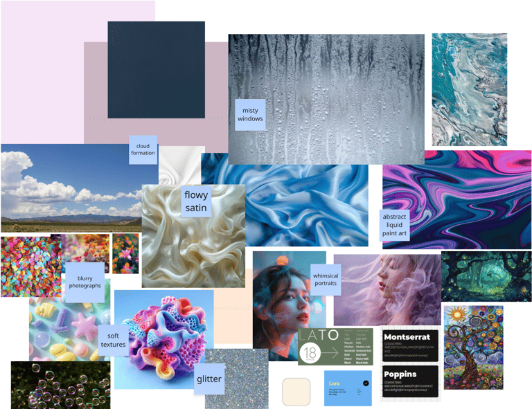 Based on my design vision and the materials I've put together, the overarching brand direction I'm pursuing is Whimsical Modernism. This style is a direct blend of two concepts: the organic and expressive qualities from my moodboard and the clean, professional structure I need for my portfolio. I use a soft, consistent purple palette across everything—from the background forms on my website to my logo and resume. This aesthetic pulls inspiration from the 'flowy satin' and 'abstract liquid paint' concepts in my moodboard, giving my digital space a friendly, artistic, and optimistic personality. At the same time, the website and resume layouts use ample white space and clear hierarchy to maintain a professional standard. This ensures that while the design is expressive, the user experience is always intuitive and strategic, helping me achieve my goal of being a designer who blends storytelling with strategy.